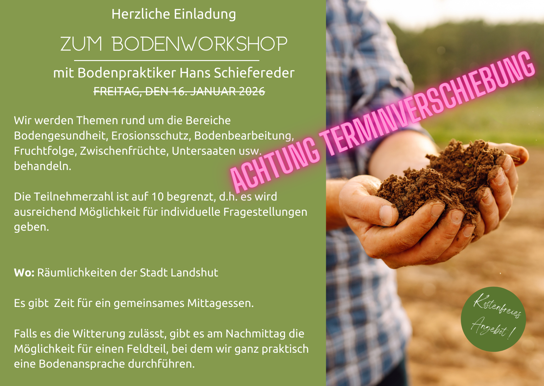 Wir werden Themen rund um die Bereiche Bodengesundheit, Erosionsschutz, Bodenbearbeitung, Fruchtfolge, Zwischenfrüchte, Untersaaten usw. behandeln. Achtung – der Termin wird auf Frühling verschoben. Interesenten:innen können sich jetzt schon anmelden.